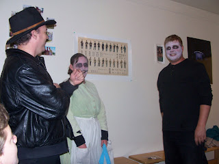 We all would meet in the basement of the Deseret Hospital to get changed, make-up and await our assigned positions. That's dad just making his way in and having a seat. Don't ya just love his "up-do"? He hid out most of the time in the corn maze. Dad had the most votes for being the best/scariest character through the duration of the Haunted Village and therefore won the contest, receiving an Ipod. YEAH ED!! Trev is standing at my post. The exit gate. There I am in all my pioneer-ish glory and hoop skirt. That was my post the majority of the time, which was great!! People didn't know if I was gonna scare them or just talk to them and take their wristbands. It was fun to see them coming running for the exit while being chased by another creepy character and to listen to their comments. Yeah, the intoxicated ones were the best! "Thanks for coming and here's a breath mint." Other times I was at Brigham's farmhouse, scaring people (that was the best!! hehehe), or hidden in the outhouse looking storage shed. This place was also great!! I scared A LOT of big macho GUYS in both places!!! It was all I could do to not laugh and stay in character when I heard these guys scream and run away. It was great to hear the comments from the guests and names they gave dad. I think the best would have to be the deranged Santa Claus or the yum-yum guy. David came away with some unusual ones as well. Indiana Jones, Cowboy Joe and the best was...Garth Brooks. All in all we had a fun time and are now looking forward to Candlelight Christmas up there. Starting the day after Thanksgiving.